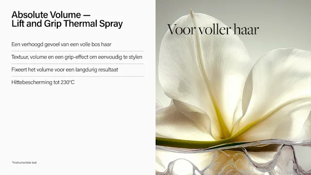 De Absolute Volume Lift and Grip Thermal Spray wordt geactiveerd door warmte. Tijdens het föhnen of stylen creëert de spray grip en ondersteuning in het haar, waardoor volume wordt opgebouwd en beter behouden blijft. Het haar voelt vol, luchtig en natuurlijk aan, met een flexibele hold die meebeweegt.